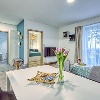 Niektóre pokoje w apartamencie posiadają balkon lub taras, gdzie możesz się cieszyć miłym wieczorem na świeżym powietrzu. Dzięki bezprzewodowemu połączeniu z Internetem (WiFi), dostępnym w apartamencie, będziesz online podczas wakacji.