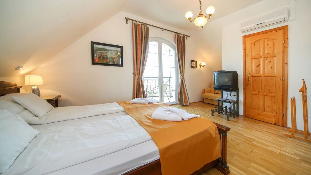 A fotó és a leírás alapján nagyobb szobára számítottunk. A tetőtéri szoba a ferde mennyezet miatt nagyon kicsinek, a 35nm helyett 12nm-esnek tűnt. Az egyik teraszajtón nincs kilincs, a függönyök lógnak. A fürdőszobaablakba elhullott bogár...sok helyen már ráférne a festés. Ha az ember borozni szeretne, taxizni kell, mert a hegyre felsétálni lehetetlen. A tévét nem tudtuk beüzemelni.