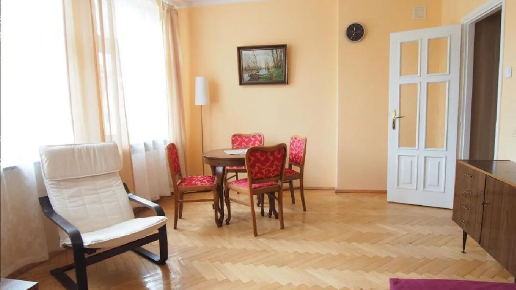 Mieszkanie składa się z dużego słonecznego salonu z rozkładaną sofą dla 2 osób , częścią jadalną i wypoczynkową. W sypialni łóżko małżeńskie. Osobna kuchnia z pełnym wyposażeniem : cztero- palnikowa kuchenka z piekarnikiem , lodówka z amrażalnikiem, zmywarka do naczyń. Łazienka z prysznicem. W łazience znajduje się pralka .