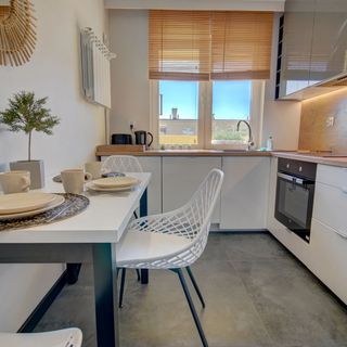 Kuchnia została w pełni przystosowana do samodzielnego przygotowywania posiłków i wyposażona w płytę indukcyjną, piekarnik, zmywarkę oraz lodówkę. Na miejscu dostępna jest także pralka, żelazko z deską do prasowania i suszarka do włosów, co zapewnia pełen komfort podczas dłuższych pobytów.