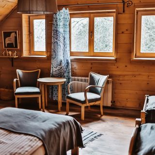 Dom ma charakter górskiej chaty, w której goście samodzielnie obsługują piec na drewno, ogrzewając nim wodę i wnętrza. To miejsce dla osób ceniących autentyczność i bliskość natury.
