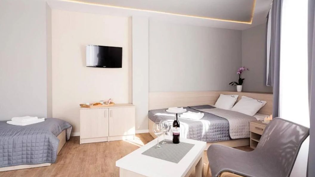 Do dyspozycji oddajemy 18 nowocześnie urządzonych pokoi 2, 3 i 4 osobowych z łazienkami. Każdy pokój wyposażony jest w łóżko małżeńskie. Ponadto oferujemy pokoje z dodatkowymi pełnowymiarowymi łóżkami jednoosobowymi zapewniającymi komfort snu. W każdym pokoju znajdują się: lodówka, zestaw do parzenia kawy i herbaty, czajnik bezprzewodowy oraz filiżanki. W standardowe wyposażenie wchodzi także płaski telewizor 32–calowy z bezpłatnym dostępem do programów telewizji satelitarnej, ręczniki, zestaw kosmetyków, a każda łazienka wyposażona jest w suszarkę do włosów. Pokoje utrzymane są w stonowanych szarościach i beżach. Okna we wszystkich naszych pokojach skierowane są na dziedziniec, co gwarantuje ciszę od miejskiego zgiełku i spokojny wypoczynek, a w lecie pozwala cieszyć się przyjemnym chłodem.