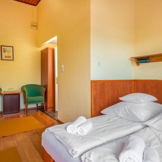 sierpień 2025Érkezéskor nagyon barátságos fogadtatásban volt részünk mind a recepciós, mind az éttermi munkatársak részéről. A szoba tiszta és funkcionális volt, meglepően tágas fürdőszobával. A parkolás zárt udvarban megoldott. Közel a buszmegálló. Mivel egy közeli fesztiválra jöttünk, így a szálláshoz tartozó egyéb szolgáltatásokat nem vettük igénybe.