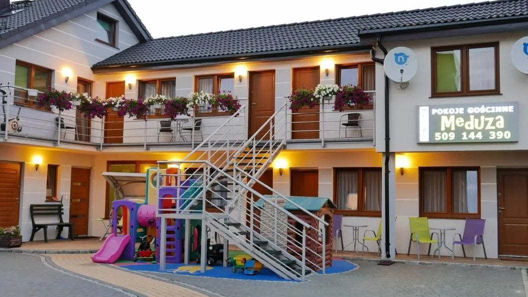 Co do samego obiektu... deklarowane miejsca parkingowe to w praktyce tylko miejsce żeby postawić samochód i zapomnieć o jego istnieniu ponieważ niewielki plac przed obiektem jest zastawiony pod sama bramę. Dzięki temu wybierając się na pobliskie atrakcje trzeba wydać dodatkowe kilkaset złotych na transport. Pokoje są skandalicznie małe. 2 osobowy pokój to w porywach 12m2 z łazienką licząc. Nogę nie za bardzo jest gdzie postawić. W łazience żeby skorzystać z toalety trzeba usiąść po skosie bo łazienka jest tak ogromna. W każdym kącie brudno i pełno pajęczyn. W apartamencie "schody" są po prostu drabina ba strych na którym trzeba się w pół zgiąć. Typowa partyzantka bo żaden inspektor nie dopuściłby czegoś takiego do użytku. Właściciele bardzo "kulturalni" na zstrzezenia odpowiadają 7 osobowej rodzinie, że zawsze mogą zrezygnować.... żenada. Za te same pieniądze polecam szukać czegoś innego. Tutaj niestety pozałuja Państwo wydanych pieniędzy.