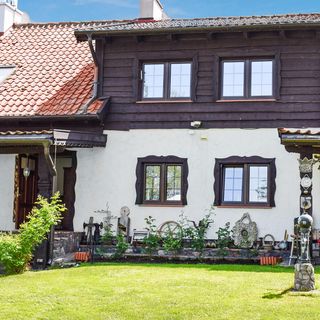 - Dom wykonany z drewna i cegły