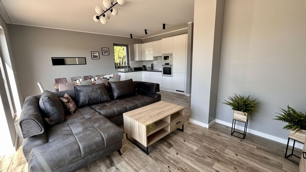 Posiada 4 sypialnie z komfortowymi łóżkami, salon z narożnikiem z możliwością spania, otwartą kuchnię wyposażoną w niezbędny sprzęt AGD/ czajnik elektryczny, lodówka, zamrażalka, zmywarka, toster, ekspres do kawy przelewowy, duży stół z krzesłami w części jadalni dla wszystkich, 2 łazienki z WC prysznicem i wanną.