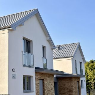 To dom w zabudowie bliźniaczej z garażami, które znajdują się na wspólnej działce. Każdy dom jest do wyłącznego użytku wraz z działką.