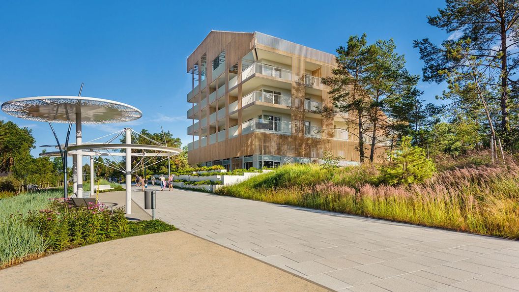 Bałtycki Apartamenty to dwa kameralne, 3-piętrowe budynki w skandynawskim stylu, położone w pierwszej linii brzegowej. Od plaży dzieli Gości zaledwie 50-100 metrów. Obiekt znajduje się pomiędzy Promenadą Zdrowia a odrestaurowaną Promenadą Uzdrowiskową.