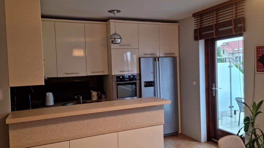 Przestrzeń mieszkania oferuje w pełni wyposażony aneks kuchenny, przestronny salon z wyjściem na taras, dwie sypialnie, toaletę oraz łazienkę z wanną.