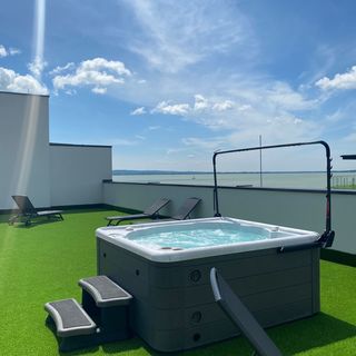 czerwiec 2025Modern, nagyon jó kilátás a balatonra, saját stég fürdőlehetőséggel,tágas, légkondis szobák, minden helységben tv, kapszulás kávéfőző kávéval, nagy és műfüves terasz.