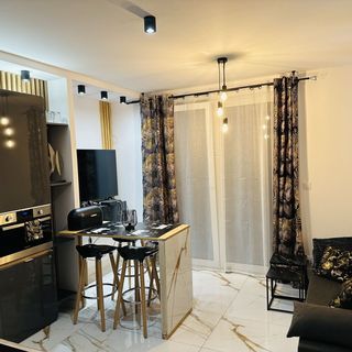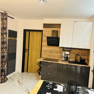 -pokój dzienny (rozkładana kanapa, stolik, telewizor 55’ , stół z 4 hokerami, aneks kuchenny (lodówka, płyta ceramiczna, piekarnik z mikrofalówką, garnki,naczynia, sztućce itd.)
