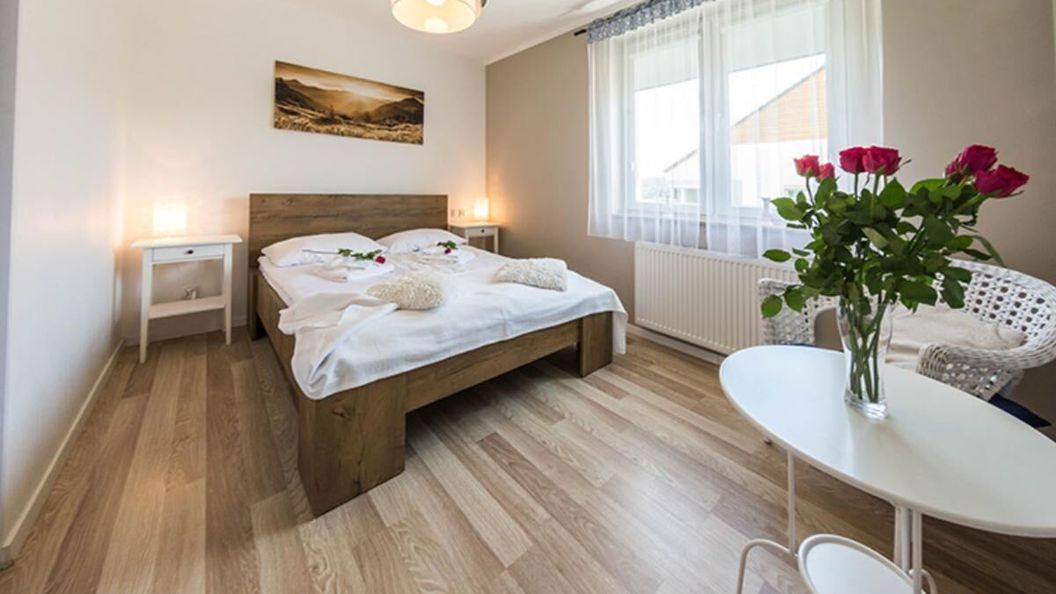 Apartament składa się z salonu z wyjściem na balkon, połączonego z aneksem kuchennym, przytulnych sypialni oraz łazienki. W apartamencie znajduje się łoże dwuosobowe, dwa łóżka pojedyncze i nierozkładana sofa, stół i krzesła, stolik kawowy oraz TV.