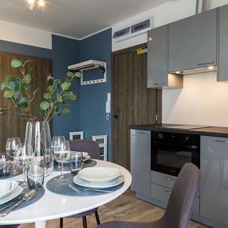 Do dyspozycji Gości jest nowoczesny aneks kuchenny z lodówką, piekarnikiem z funkcją mikrofali, zmywarką, ekspresem do kawy oraz kompletem naczyń i akcesoriami kuchennymi, szklanki i kieliszki do wina. Wszystko co niezbędne, aby samodzielnie przygotować posiłki i cieszyć się wspólnymi chwilami w gronie rodziny lub znajomych.