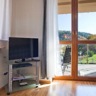 Apartament dysponuje telewizorem, balkonem i częścią wypoczynkową. Obejmuje on sypialnię oraz salon z aneksem kuchennym z kuchenką mikrofalową i lodówką. W łazience do dyspozycji Gości jest suszarka do włosów oraz wanna lub prysznic. Z apartamentu można podziwiać widok na góry.
