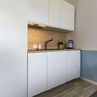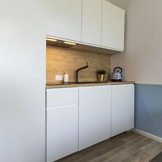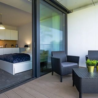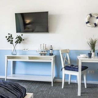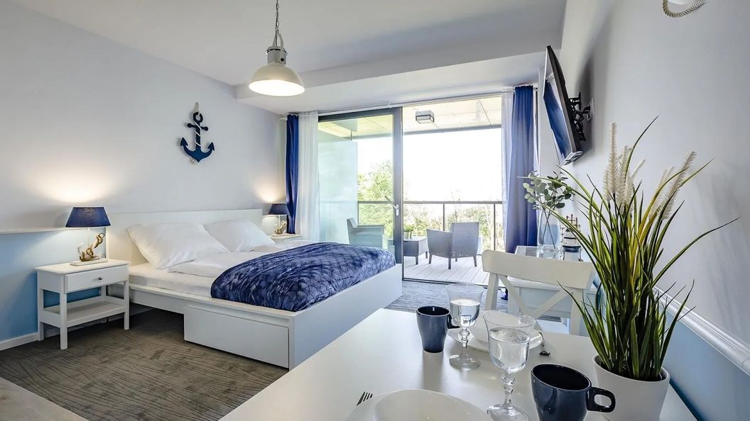 Przestronny apartament typu studio urządzony został w stylu marynistycznym, nawiązując do morskiego krajobrazu za oknem. Wnętrze wyposażono w wygodne podwójne łóżko, telewizor, dostęp do Wi-Fi oraz aneks kuchenny z podstawowym wyposażeniem, co umożliwia przygotowanie prostych posiłków. To miejsce idealne na romantyczny wyjazd nad morze lub spokojny wypoczynek z dala od tłumów.