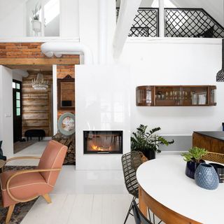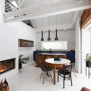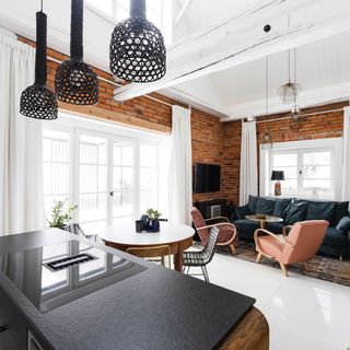 - salon z rozkładaną kanapą (mogą spać 2 osoby) i kominkiem połączony z kuchnią,