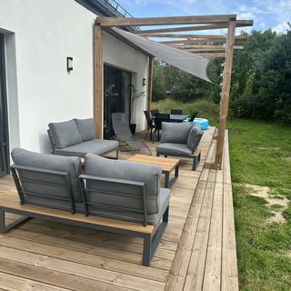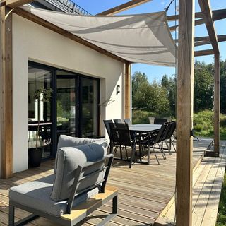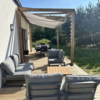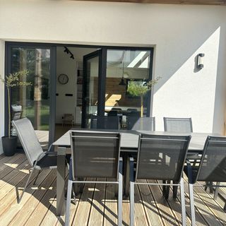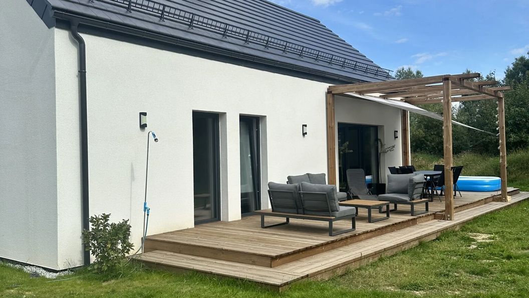 - dom otoczony jest dużym ok. 70 m2 drewnianym tarasem na którym dostępny jest stół z 8 krzesłami, meble wypoczynkowe oraz leżaki;