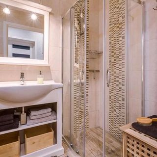-łazienka z prysznicem, toaletą i umywalką,