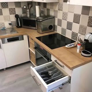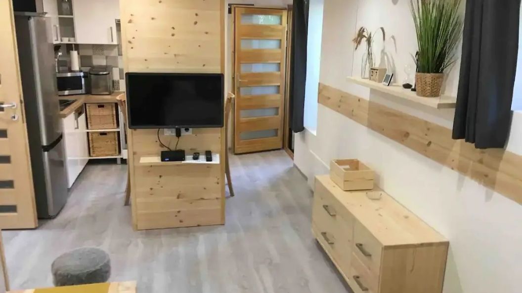 Wnętrze jest w pełni wyposażone. Aneks kuchenny zawiera płytę grzejną, zmywarkę, lodówkę, kuchenkę mikrofalową oraz czajnik elektryczny. W części wypoczynkowej znajduje się telewizor Smart TV. Wyposażenie obejmuje również ręczniki, suszarkę do włosów, kapcie i kosmetyki łazienkowe.