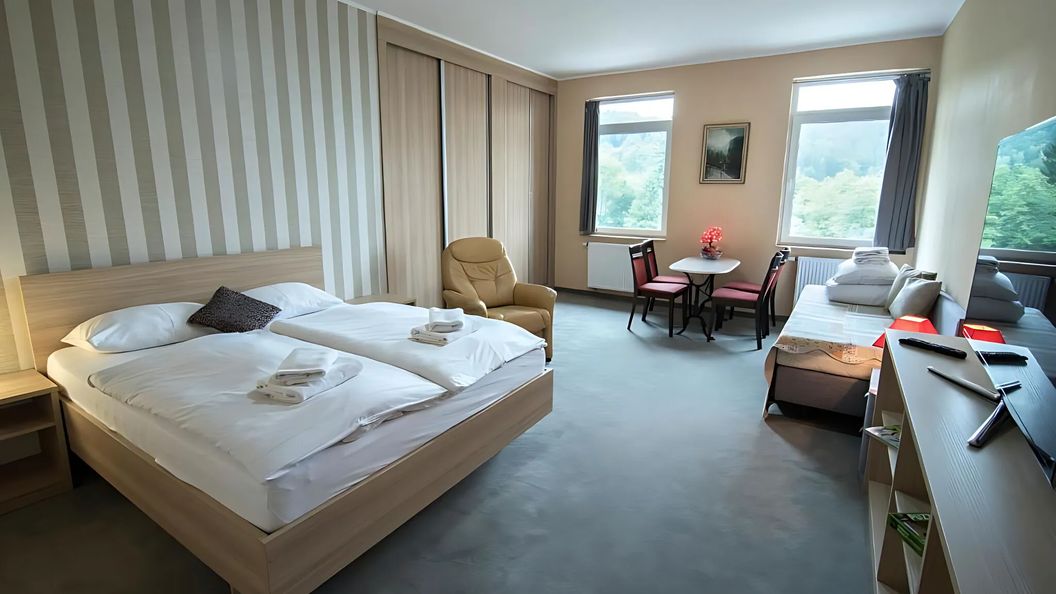 Pokoje 1, 2, 3 i 4 osobowe oraz apartamenty 4 do 8 osobowe z łazienkami i tv oraz lodówkami. Standardowa cena zawiera śniadanie w formie bufetu szwedzkiego. Nielimitowany dostęp do strefy SPA ( basen & sauna ). Ogólnie dostępna jadalnia dla gości kawa i herbata gratis. Bezpłatne Wi-Fi ( w ogólnie dostępnych miejscach). Sala zabaw dla dzieci bilard tenis stołowy oraz piłkarzyki. Plac zabaw dla dzieci na zewnątrz! Na wyposażeniu obiektu są łóżeczka turystyczne dla dzieci oraz foteliki do karmienia.