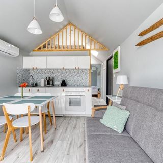 Domek w Karpnikach to komfortowo urządzony domek z w pełni wyposażoną kuchnią ( płyta indukcyjna, piekarnik, zmywarka, lodówka , czajnik kuchenka mikrofalowa, ekspres do kawy) salonem, sypialnią oraz antersolą, na której znajdują się dwa materace do spania ( głównie z myślą o dzieciach).