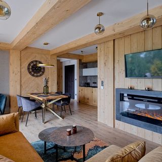Salon: stół, krzesła, TV, rozkładana sofa, stolik kawowy, wyjście na przestronny taras. Całość dopełniają gustowne elementy dekoracyjne wraz z nutą regionalnego stylu Podhala.