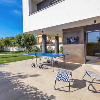 Przestrzeń wokół domu została zagospodarowana z myślą o aktywnym wypoczynku na świeżym powietrzu. Na ogrodzonym terenie znajduje się miejsce do grillowania oraz boiska do gry w koszykówkę, siatkówkę i piłkę nożną.
