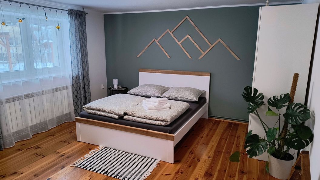 Do dyspozycji gości mamy do wynajęcia apartament o powierzchni (60m2). Dwa pokoje które mogą pomieścić 6 osób, w jednym z pokoi znajduje się duże łózko małżeńskie oraz rozkładany fotel , natomiast w drugim pokoju także jest duże łózko 2 osobowe oraz jedno pojedyncze. W każdym pokoju znajduje się telewizor oraz bezpłatne Wifi.
