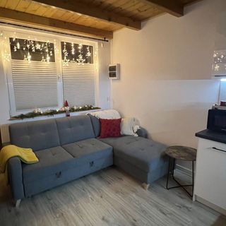 Salon posiada narożnik z funkcją spania dla dwóch osób, telewizor.