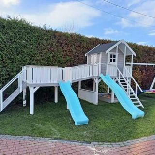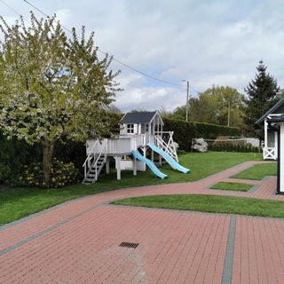plac zabaw - domek, dwie huśtawki, zjeżdżalnia, piaskownica.