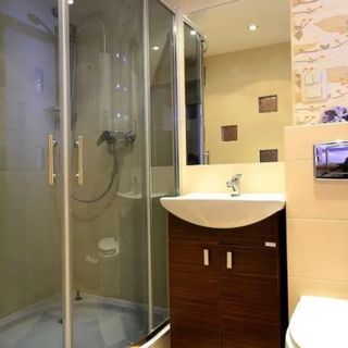 Łazienka, w której znajduje się kabina prysznicowa, umywalka, WC.