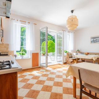 Goście mogą korzystać z w pełni wyposażonej kuchni, idealnej do przygotowywania śniadań i kolacji. Z kuchni prowadzi wyjście na duży taras oraz do pięknie zagospodarowanego ogrodu. W ogrodzie czeka altana z grillem – świetna do wieczornego biesiadowania – oraz miejsce do opalania.