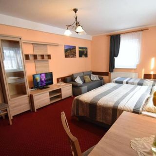 lipiec 2018Pensjonat bardzo czysty,duza przestronna kuchnia , dobrze wyposarzona. Troszkę daleko do centrum ale mozna znalezc busa za 30 zl (my jezdzilismy w 9 osób). Jedynie co mnie denerwowało ze wzgledu na to ze moje dzieci boją się, to latajacy i szczekajacy pies wlascicieli