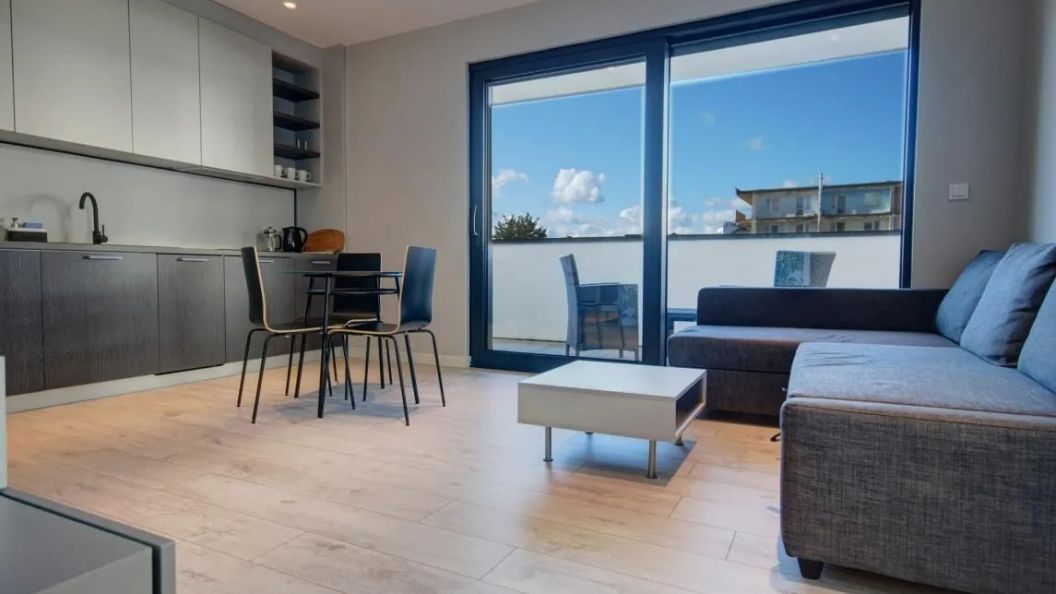 Lokal o powierzchni 35 m² znajduje się na pierwszym piętrze i został funkcjonalnie zaaranżowany. Do dyspozycji gości jest osobna sypialnia, salon połączony z aneksem kuchennym oraz łazienka. Dużym atutem jest przestronny taras, na który można wyjść z każdego z pomieszczeń. Dzięki południowo-zachodniej ekspozycji wnętrza są dobrze doświetlone przez większą część dnia.