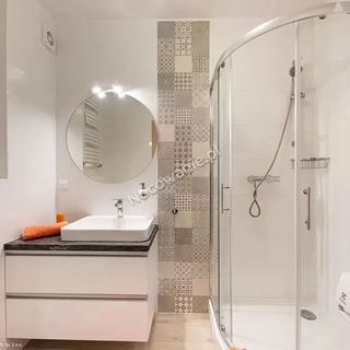 Łazienka z kabiną prysznicową, suszarką do włosów, pralką.