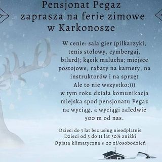 Obiekt Pegaz, usytuowany w miejscowości Karpacz, oferuje ogród, bezpłatny prywatny parking oraz taras. Odległość ważnych miejsc od obiektu: Wang Church – niecały kilometr. W okolicy znajdują się ciekawe miejsca takie jak: Park Dinozaurów ( 27 km), PKS Szklarska Poręba ( 28 km), Zakręt Śmierci ( 28 km). Obiekt jest idealnym wyborem dla niepalących. Odległość ważnych miejsc od obiektu: Western City – 10 km.