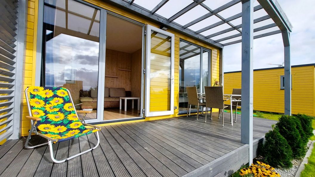 - dużego tarasu (zadaszony lub nie w zależności od rodzaju domku)