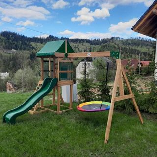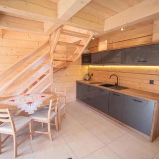 Do dyspozycji gości jest cały, 8-osobowy drewniany dom z widokiem na góry. Na parterze znajduje się salon z rozkładaną kanapą dla 2 osób, w pełni wyposażony aneks kuchenny oraz łazienka. Piętro budynku zajmują dwie oddzielne, 3-osobowe sypialnie. Taki układ pomieszczeń zapewnia komfortowy pobyt większym grupom lub rodzinom, gwarantując jednocześnie prywatność.