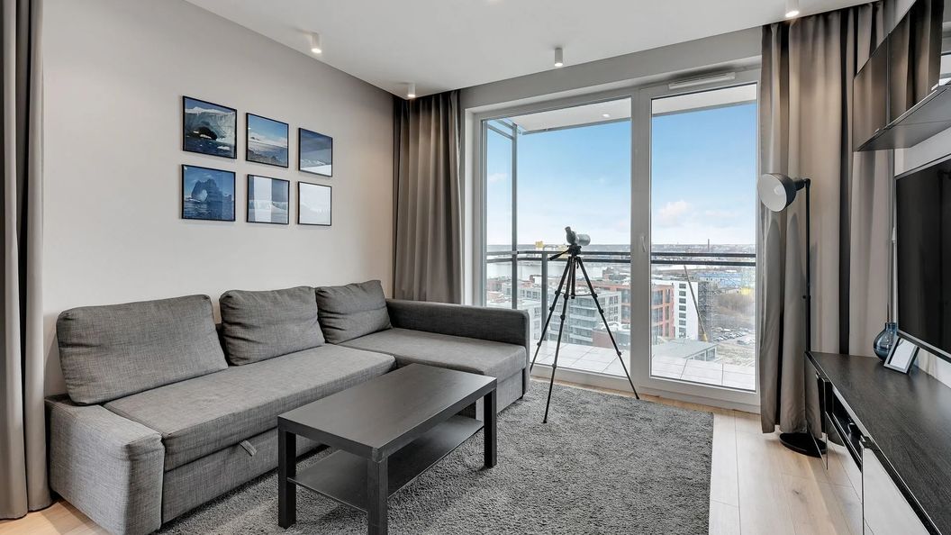 Apartament składa się z pokoju dziennego z aneksem kuchennym, dwóch sypialni, łazienki, oddzielnej toalety oraz przestronnego tarasu z widokiem na panoramę Gdańska (14. piętro).
