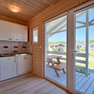 Każdy z domków posiada 2 oddzielnie sypialnie, aneks kuchenny, łazienkę i taras. Kuchnia w pełni wyposażona, na tarasie ława albo stół z krzesłami, leżak oraz parawan.