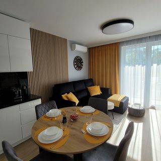 Apartamenty Stylowe w Kołobrzegu to 2-pokojowy apartament oddany w czerwcu 2023 roku do użytkowania. Znajduje się na nowym, zielonym osiedlu w odległości 850 m od najnowszego i najdłuższego w Polsce nadmorskiego deptaku i plaży, a także w sąsiedztwie Ekoparku Wschodniego. Do Amfiteatru 1,5 km. Nowoczesne i bardzo dobre wyposażenie z klimatyzacją zapewni znakomity wypoczynek. W standardowym wyposażeniu zapewniamy cukier, sól, herbatę, kawę, a także takie drobiazgi jak płyn do naczyń, mydło, tabletki do zmywarki itp. Na terenie osiedla znajduje się mini siłownia zewnętrzna, a także place zabaw. Oferujemy bezpłatne miejsce postojowe. Przy osiedlu jest droga rowerowa, która ciągnie się kilometrami wzdłuż linii brzegowej. W razie niepogody w apartamencie są książki, TV, ciepły koc. W odległości ok. 600 m sklep Biedronka, apteka, 1 km - Mc Donalds. Oferta apartamentu obejmuje 1 sypialnię, salon, aneks kuchenny z pełnym wyposażeniem, w tym lodówką i ekspresem do kawy, a także 1 łazienkę z prysznicem oraz suszarką do włosów. W apartamencie zapewniono ręczniki i pościel.