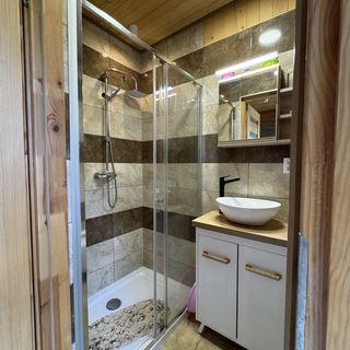 salon z aneksem kuchennym, łazienki (prysznic, toaleta, umywalka) oraz