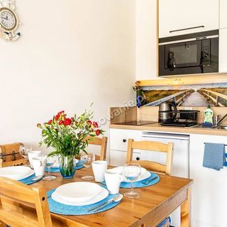 Na parterze domku znajduje się salon wyposażony w narożnik (z funkcją spania – dwuosobowy), stół 4 osobowy, aneks kuchenny, druga łazienka z prysznicem z pełnym węzłem sanitarnym.