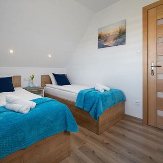 Dwa domki 6 osobowe, które składają się z dwóch sypialni dwuosobowych na piętrze, z czego jedna wyposażona jest w podwójne łóżko, natomiast druga w dwa łóżka pojedyncze.