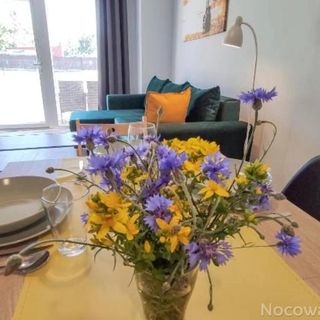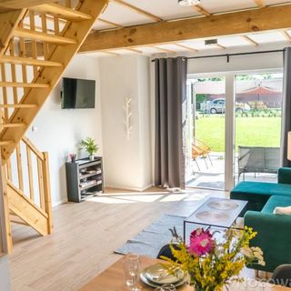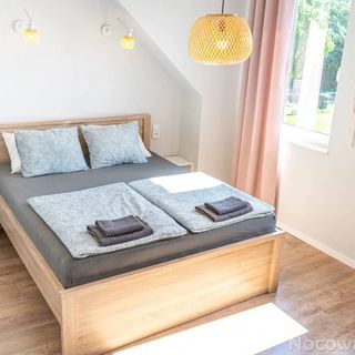 Każdy przestronny domek o powierzchni 70m2 składa się z dwóch oddzielnych sypialni na piętrze. W pierwszej sypialni znajduje się duże wygodne łózko małżeńskie i jedno pojedyncze, natomiast w drugiej są dwa łózka pojedyncze z możliwością połączenia oraz dodatkowe łózko pojedyncze. Na piętrze w dwóch sypialniach mamy 6 miejsc do spania. Dodatkowe 2 miejsca znajdują się na parterze (rozkładana wygodna sofa z możliwością spania dla dwóch osób). Na parterze każdego domku jest nowoczesna łazienka oraz przestronny salon z aneksem kuchennym wyposażony w płytę indukcyjną, piekarnik, czajnik elektryczny, ekspres do kawy, lodówkę oraz zmywarkę. Znajdują się oczywiście wszystkie niezbędne sprzęty gospodarstwa domowego takie jak sztućce, naczynia, szklanki, talerze itp. W pokoju dziennym na parterze jest także rozkładana wygodna sofa i płaski telewizor z dostępem do Internetu.