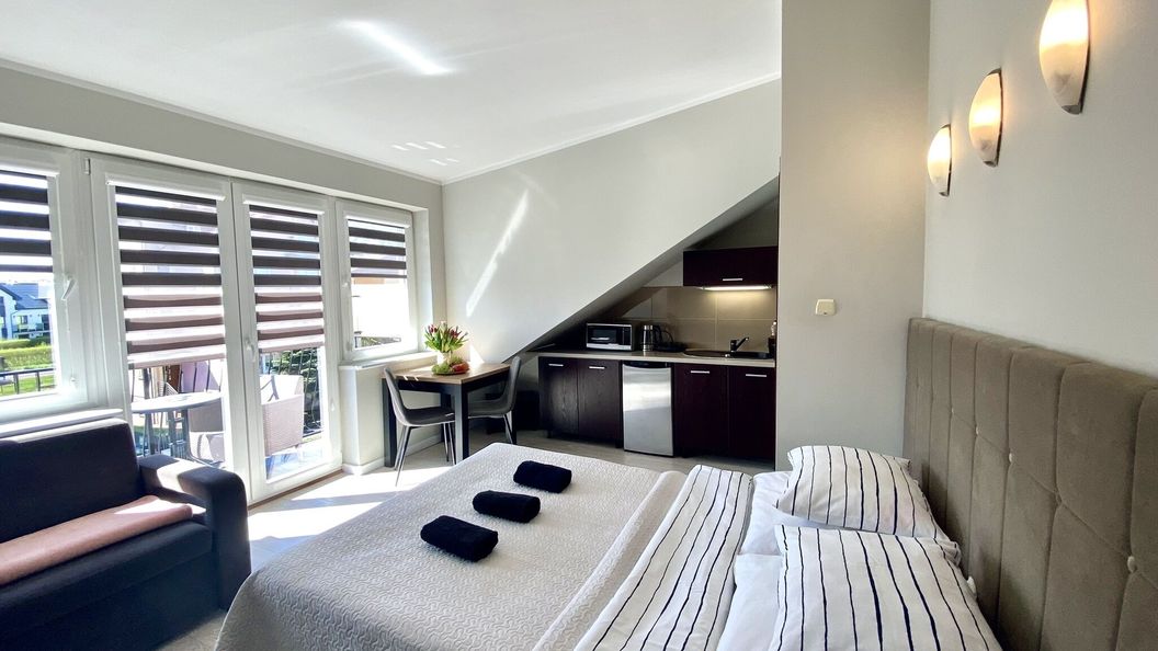 Oferujemy przytulne 1- i 2-pokojowe jednostki mieszkalne przeznaczone dla 3, 4 lub 5 osób. Każdy pokój posiada prywatną łazienkę, aneks kuchenny, lodówkę, telewizję kablową oraz dostęp do internetu Wi-Fi. Większość pokoi posiada również balkon, co dodatkowo zwiększa komfort pobytu. Na sąsiedniej posesji dostępne są miejsca parkingowe dla gości.