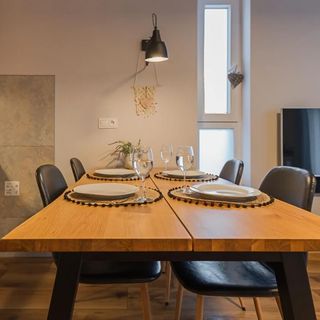 Do dyspozycji Gości jest nowoczesny aneks kuchenny z lodówką oraz kompletem naczyń i akcesoriami kuchennymi, szklanki i kieliszki do wina. Wszystko co niezbędne, aby samodzielnie przygotować posiłki i cieszyć się wspólnymi chwilami w gronie rodziny lub znajomych.