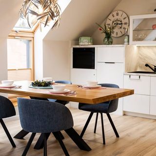 W apartamencie znajduje się w pełni wyposażony aneks kuchenny. Naszych Gościom udostępniamy sprzęt AGD m.in. lodówkę, zmywarkę, kuchenkę z okapem oraz komplet naczyń, sztućce, akcesoria kuchenne, szklanki i kieliszki do wina. Wszystko, co potrzebne by samodzielnie przygotować posiłki i cieszyć się wspólnymi chwilami z bliskimi.