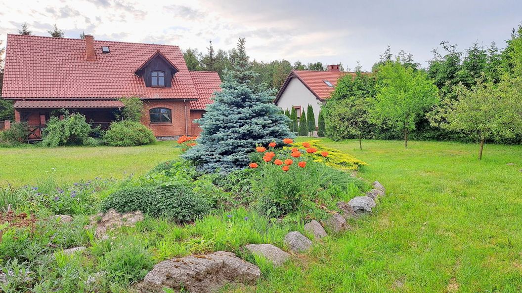Dom otoczony jest dużym ogrodem, który zapewnia przestrzeń do rekreacji. Na terenie posesji przygotowano wydzielone miejsce na grilla. Obiekt jest przyjazny zwierzętom, a zmotoryzowani goście mogą korzystać z bezpłatnego, prywatnego parkingu.