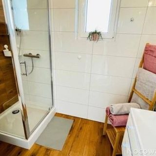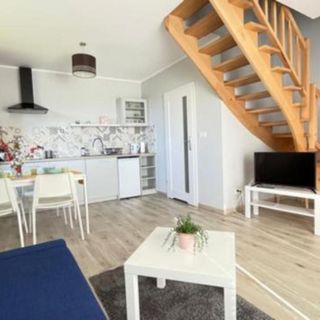 Na dole znajduje się salon (narożnik rozkładany dla 2 osób) z kuchnią (sztućce, talerze, kubki, kieliszki, garnki, płyta 2 palnikowa indukcyjna, czajnik bezprzewodowy), lodówka,mikrofalówka, tv oraz łazienka z pełnym węzłem sanitarnym, suszarka na ubrania oraz do włosów.